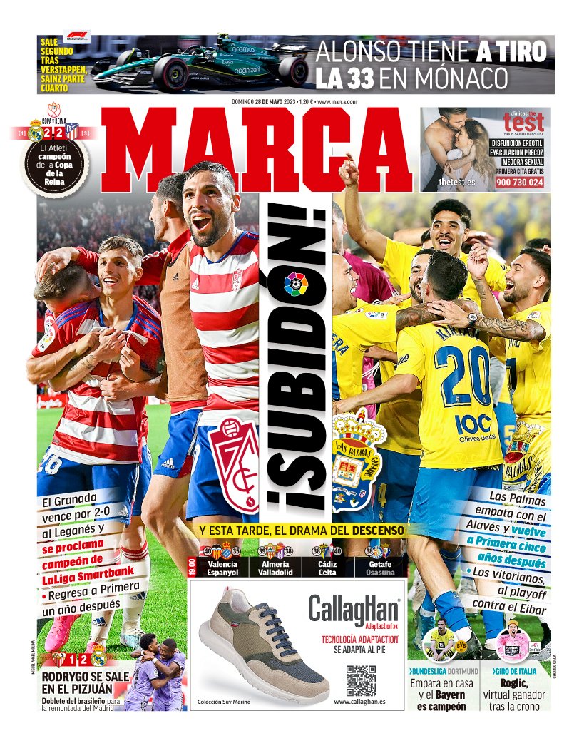 El diario Marca dedica su portada de hoy a los ascensos a Primera División de Granada y Las Palmas, que volverán a ser rivales del Real Madrid el próximo curso en Liga.
