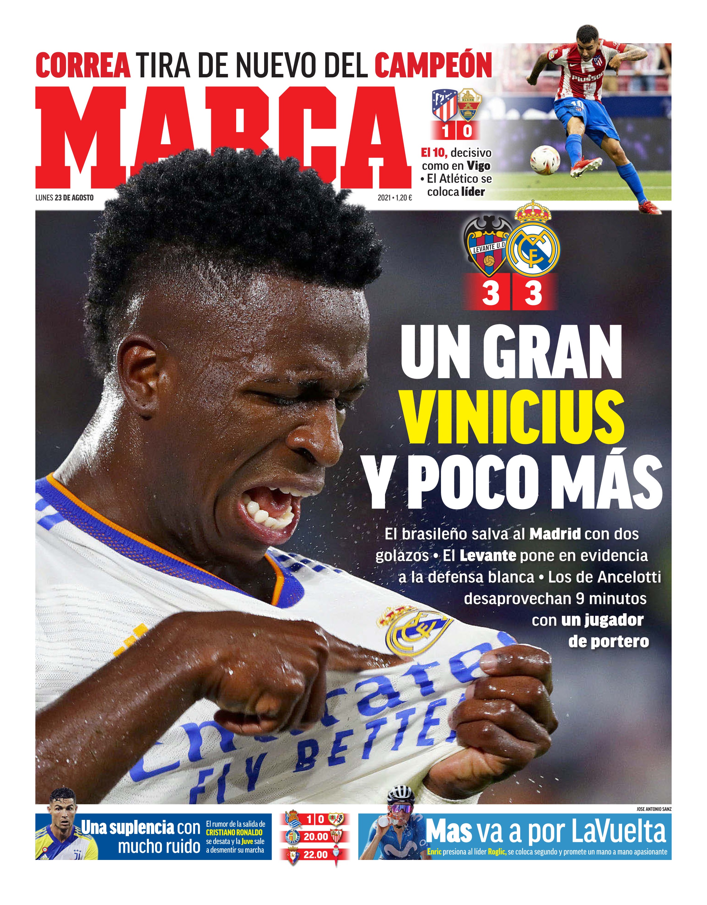 El diario Marca abre su portada del lunes con el empate del Real Madrid en el Ciutat de Valencia (3-3). Vinicius fue clave saliendo en la segunda parte y anotando un doblete para rescatar un punto ante el Levante.