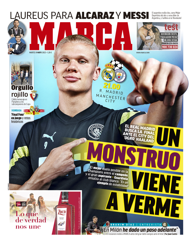 En este martes 9 de mayo, el diario Marca resalta la visita de Erling Haaland al Santiago Bernabéu, donde esta noche se enfrentarán el Real Madrid y el Manchester City en la ida de las semifinales de la Champions League.