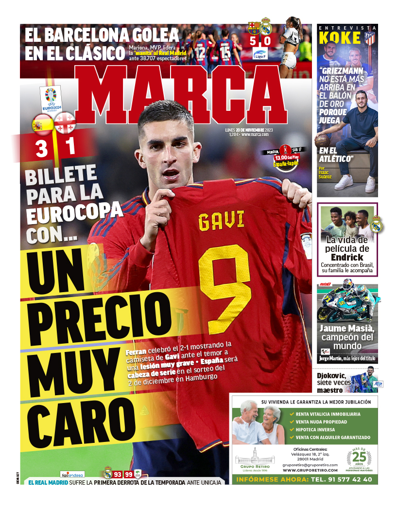 En su edición de este lunes, la portada del diario Marca viene protagonizada por la victoria de España ante Georgia.