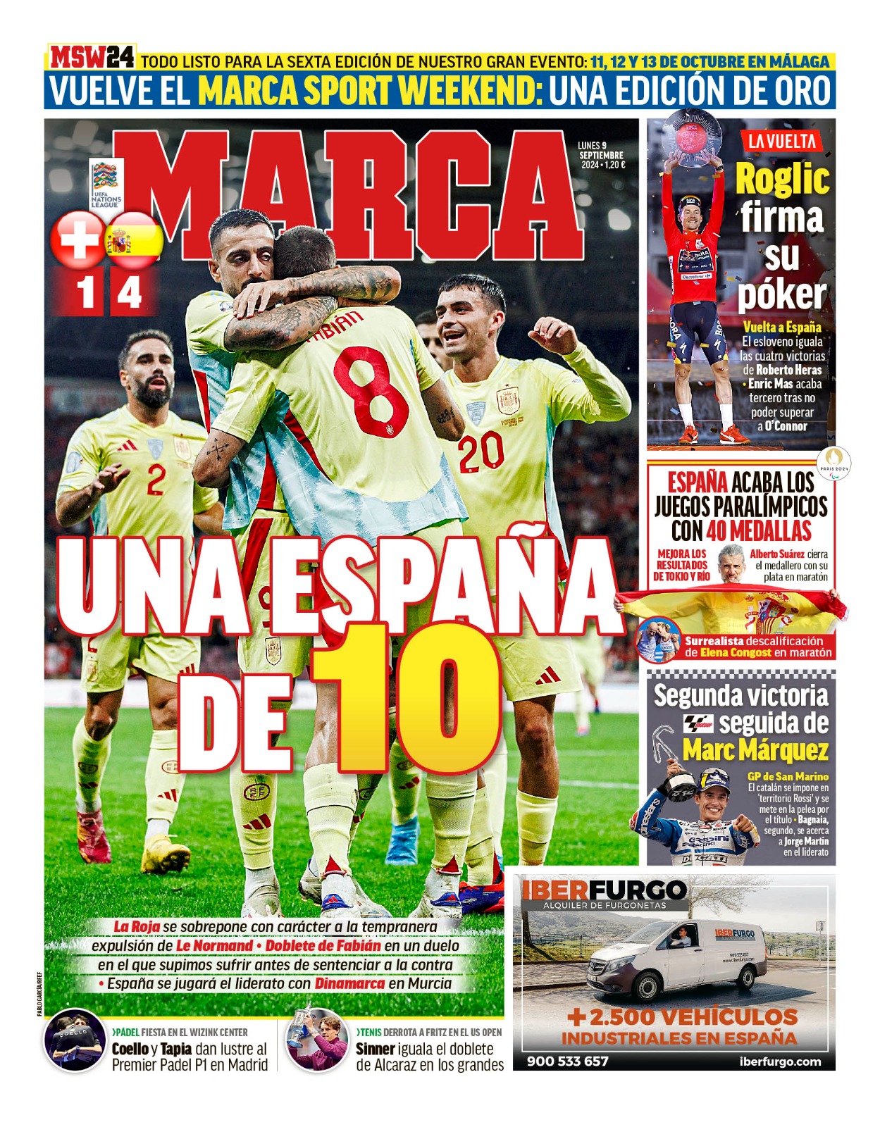 Este lunes 9 de septiembre de 2024, el diario Marca saca en portada la gran victoria de España frente a Suiza (1-4) en la Nations League.