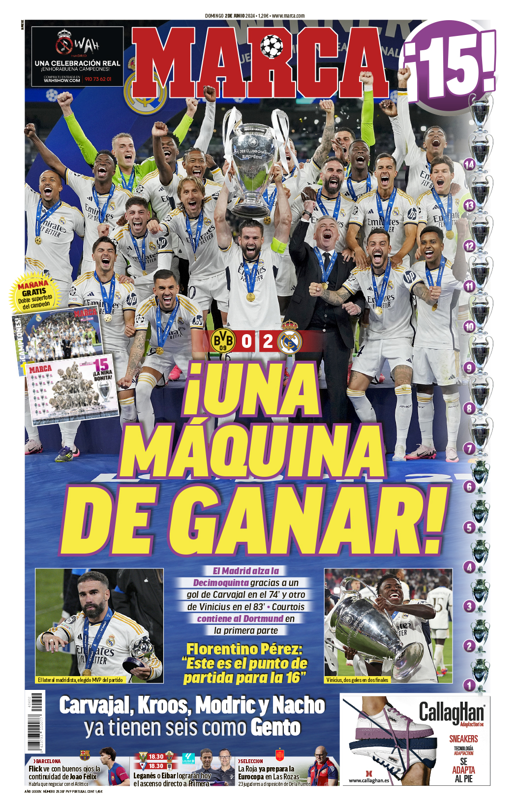 El diario Marca destaca en su portada la victoria del Real Madrid para ganar su decimoquinta Copa de Europa de la historia.