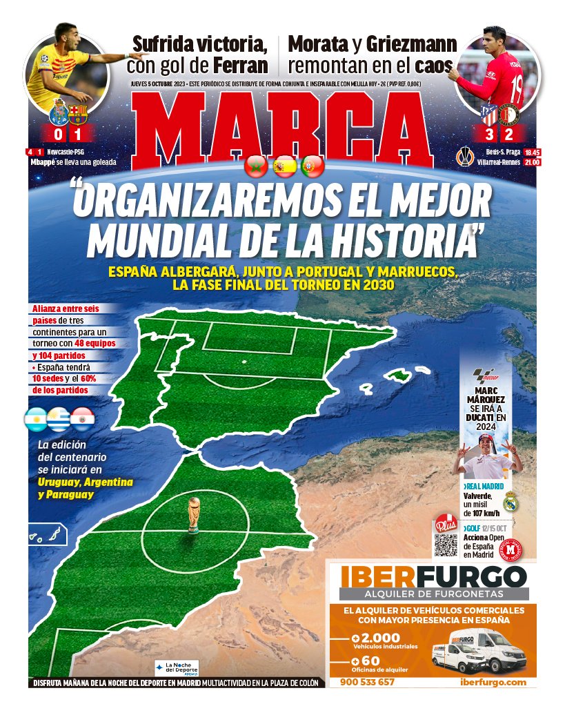 La portada de hoy del diario Marca comenta la velocidad del disparo de Fede Valverde en la victoria del Real Madrid ante el Nápoles.