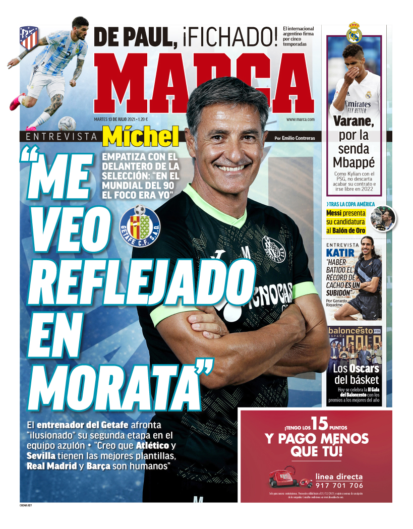 El diario Marca saca en su portada para este martes a un Raphael Varane que, al igual que Kylian Mbappé con el Paris Saint-Germain, no descarta aguantar una temporada más con el Real Madrid y salir libre en 2022. Asimismo, el periódico también publica una entrevista exclusiva con Míchel, el nuevo entrenador del Getafe.