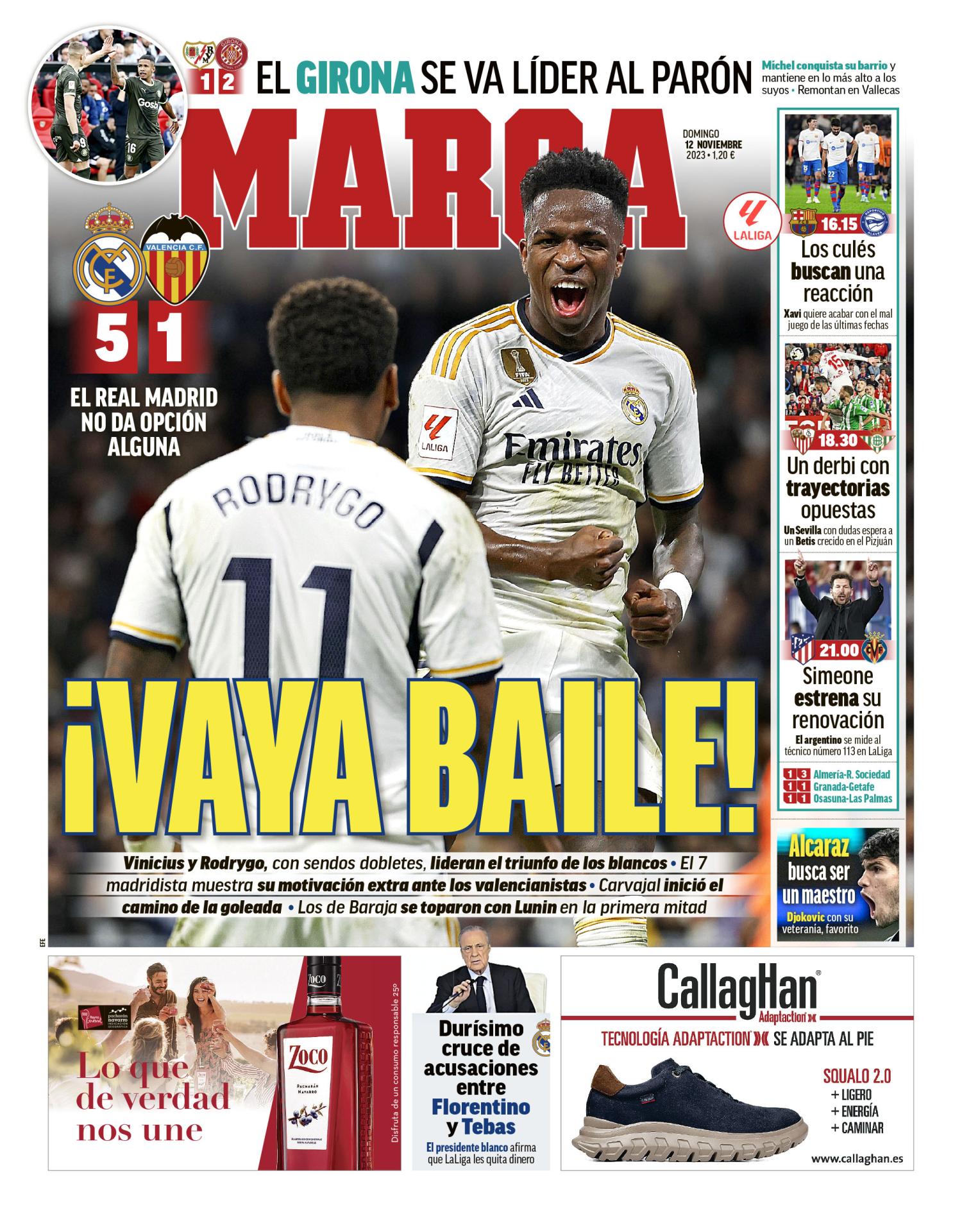 Este domingo 12 de noviembre, el diario Marca destaca en portada la goleada del Real Madrid al Valencia (5-1) con recital incluido de Vinicius y Rodrygo, autores de dos goles cada uno. "¡Vaya fiesta!", titula.