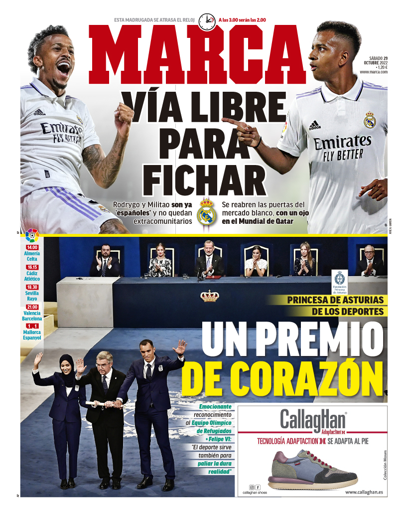 En su edición de este sábado, el diario Marca destaca en portada la consecución del pasaporte español tanto de Rodrygo como de Militao y que permite al Real Madrid tener disponibles las tres plazas de extracomunitarios: "Vía libre para fichar. Se reabren las puertas del mercado blanco con un ojo en el Mundial de Qatar", explica el periódico madrileño.