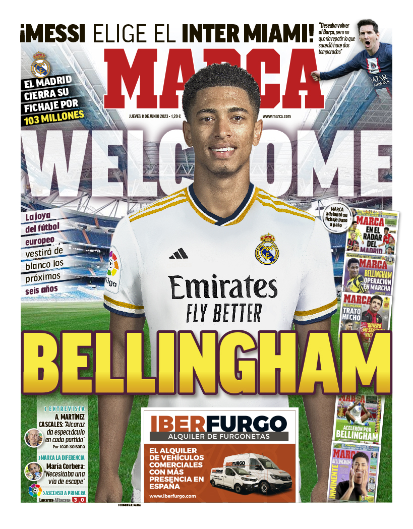 Para este jueves 8 de junio, el diario Marca destaca en portada el fichaje de Jude Bellingham por el Real Madrid, que finalmente ha pagado 103 millones de euros por los servicios del astro inglés.