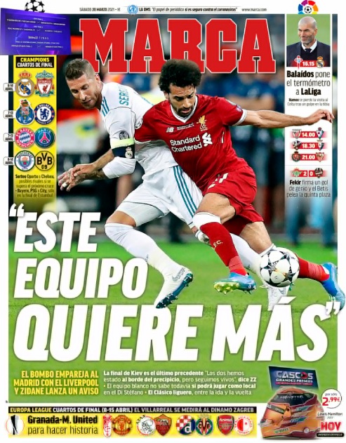 El diario Marca abre este sábado con la resaca del sorteo de la Champions y las palabras de Zidane. El entrenador del Real Madrid destaca el hambre de títulos de su equipo. El Liverpool, próximo escollo en Europa.