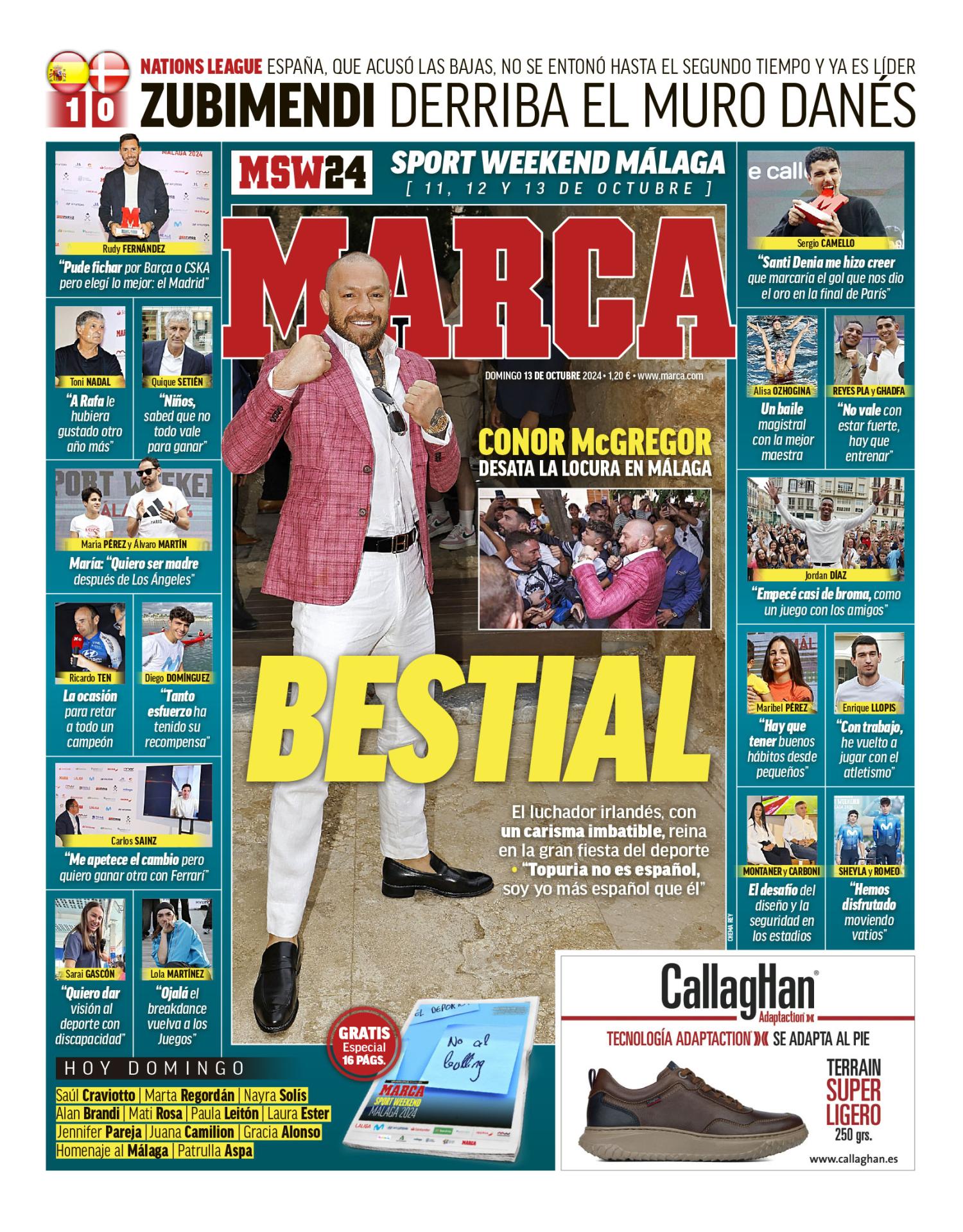 Este domingo 13 de octubre de 2024, el diario Marca saca en portada la visita de Conor McGregor a Málaga, y la victoria de la selección española ante Dinamarca (1-0) en la Nations League.