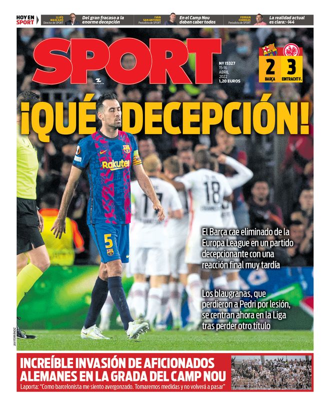 En su edición de este viernes, la portada del diario Sport destaca el último ridículo europeo del FC Barcelona, que no ha podido pasar de cuartos de final de la Europa League ante el Eintracht Frankfurt, equipo que ocupa la 9ª posición en la Bundesliga. Las gradas del Camp Nou, para mayor vergüenza, estuvieron plagadas de aficionados germanos.