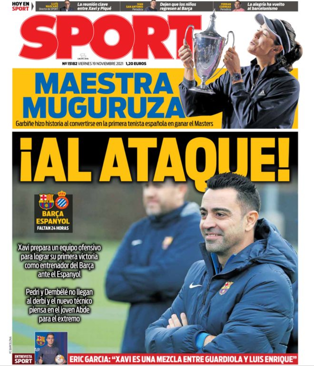 Sport destaca en su portada de hoy, viernes 19 de noviembre, el plan de Xavi Hernández para derrotar al Espanyol en el derbi catalán de mañana en el Camp Nou.