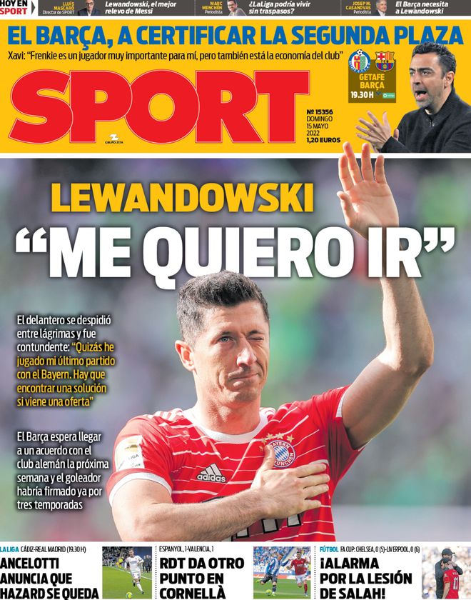 El diario Sport saca hoy en portada a un Robert Lewandowski, decidido a dejar el Bayern, y también destaca las últimas declaraciones de Carlo Ancelotti, confirmando la continuidad de Hazard en el Real Madrid.