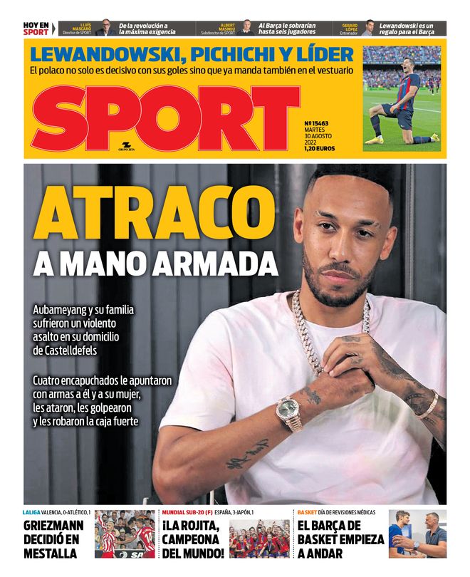 La portada del martes del diario Sport viene protagonizada por Aubameyang, futbolista del FC Barcelona que sufrió un violento asalto en su domicilio de Castelldefels por cuatro encapuchados.