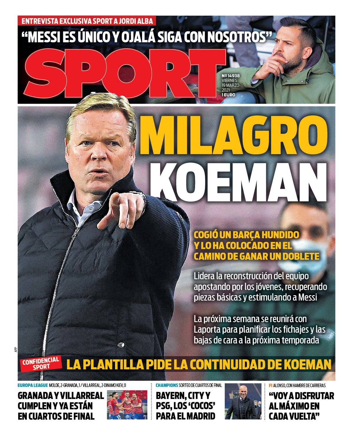 El diario Sport saca hoy en portada una entrevista exclusiva con Jordi Alba, el milagro de Koeman y los 'cocos' del Real Madrid en el sorteo de Champions.