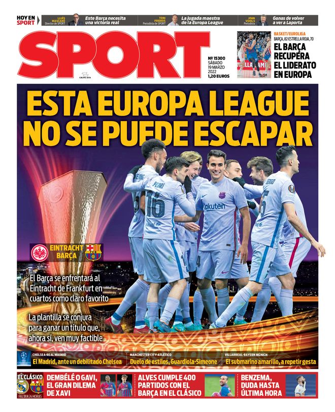 El diario Sport dedica parte su portada de hoy a la gran incógnita del clásico. Karim Benzema será duda hasta el último momento para medirse el domingo contra el FC Barcelona (21:00 hora española, estadio Santiago Bernabéu). En cuanto a lo principal, hacen referencia al Eintracht de Frankfurt, rival al que tendrán que batir en la próxima eliminatoria de la Europa League: "Este título no se nos puede escapar".