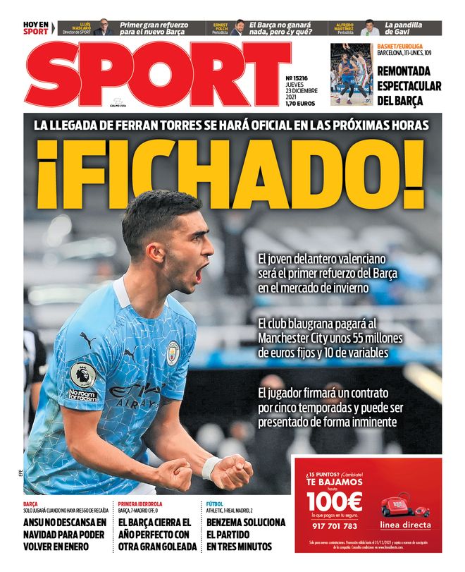 El diario Sport saca hoy en portada a Ferran Torres y asegura que ya está fichado por el FC Barcelona y también destaca el doblete de Benzema para darle la victoria al Real Madrid ante el Athletic.