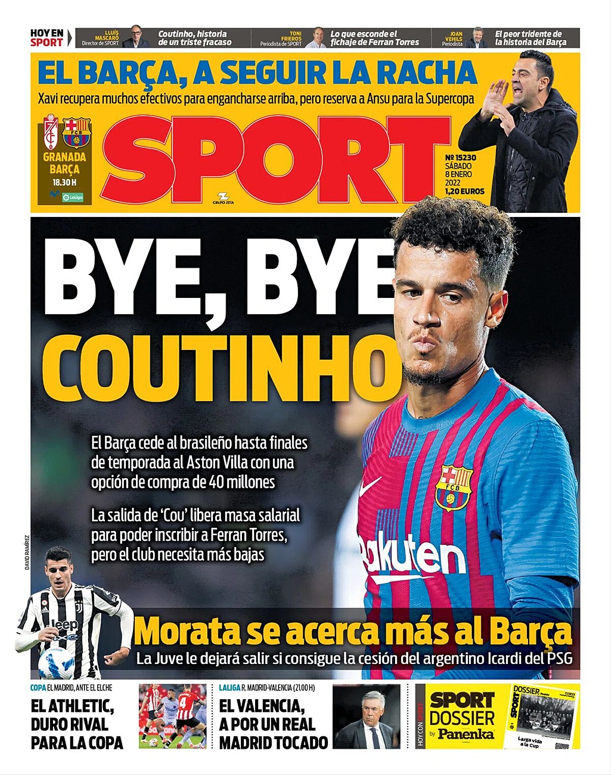El diario Sport dedica su portada de este sábado a la cesión de Philippe Coutinho al Newcastle. El brasileño libera suficiente masa salarial para inscribir a Ferran Torres y, en caso de convencer a las hurracas, podrán ejercer una opción de compra por unos 40 millones de euros. También dedican un hueco a Álvaro Morata, quién estaría cada vez más cerca del Camp Nou.