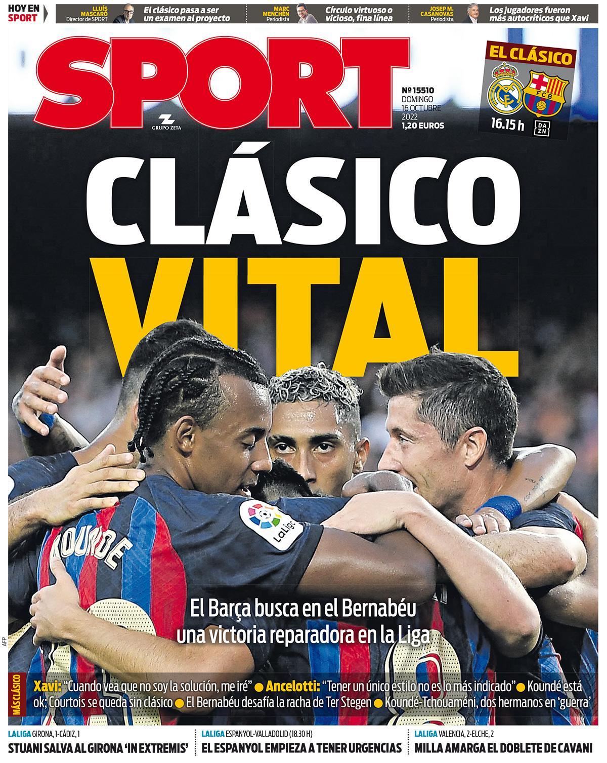 El diario Sport destaca este domingo en portada el clásico entre el Real Madrid y el Barcelona. Un partido "vital" para el conjunto azulgrana después del batacazo en Champions League contra el Inter.