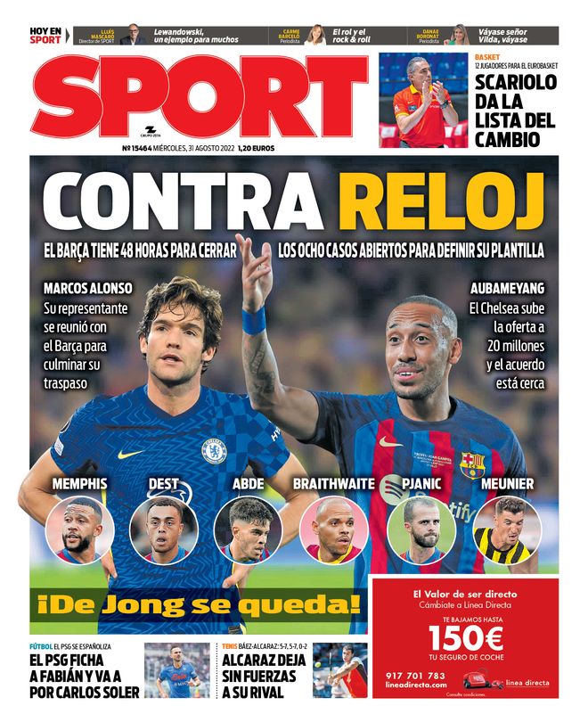 En su edición de este miércoles, la portada del diario Sport viene protagonizada por el cierre de mercado en el FC Barcelona, que mantiene hasta ocho operaciones abiertas entre posibles fichajes (Marcos Alonso se puede cerrar hoy) y salidas.