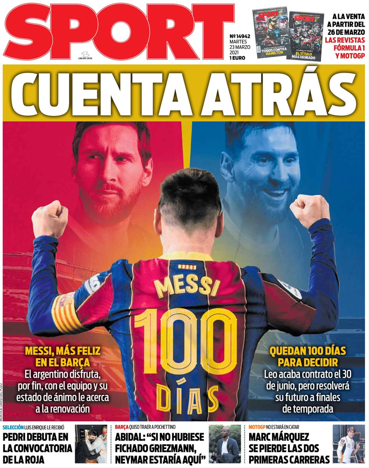 El diario Sport saca hoy en portada la "cuenta atrás" para el culebrón Messi al que le faltan 100 días para que expire su contrato con el FC Barcelona.