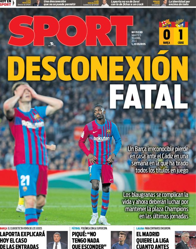 El diario Sport saca hoy en portada el batacazo del FC Barcelona ante el Cádiz en el Camp Nou y las ganas del Real Madrid por ganar LaLiga para centrarse en la Champions League.