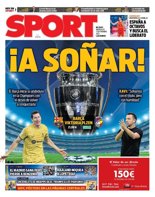 El diario Sport saca este miércoles en portada el "sueño" del FC Barcelona con la Champions League y la victoria del Real Madrid frente al Celtic, con lesión de Benzema incluida.