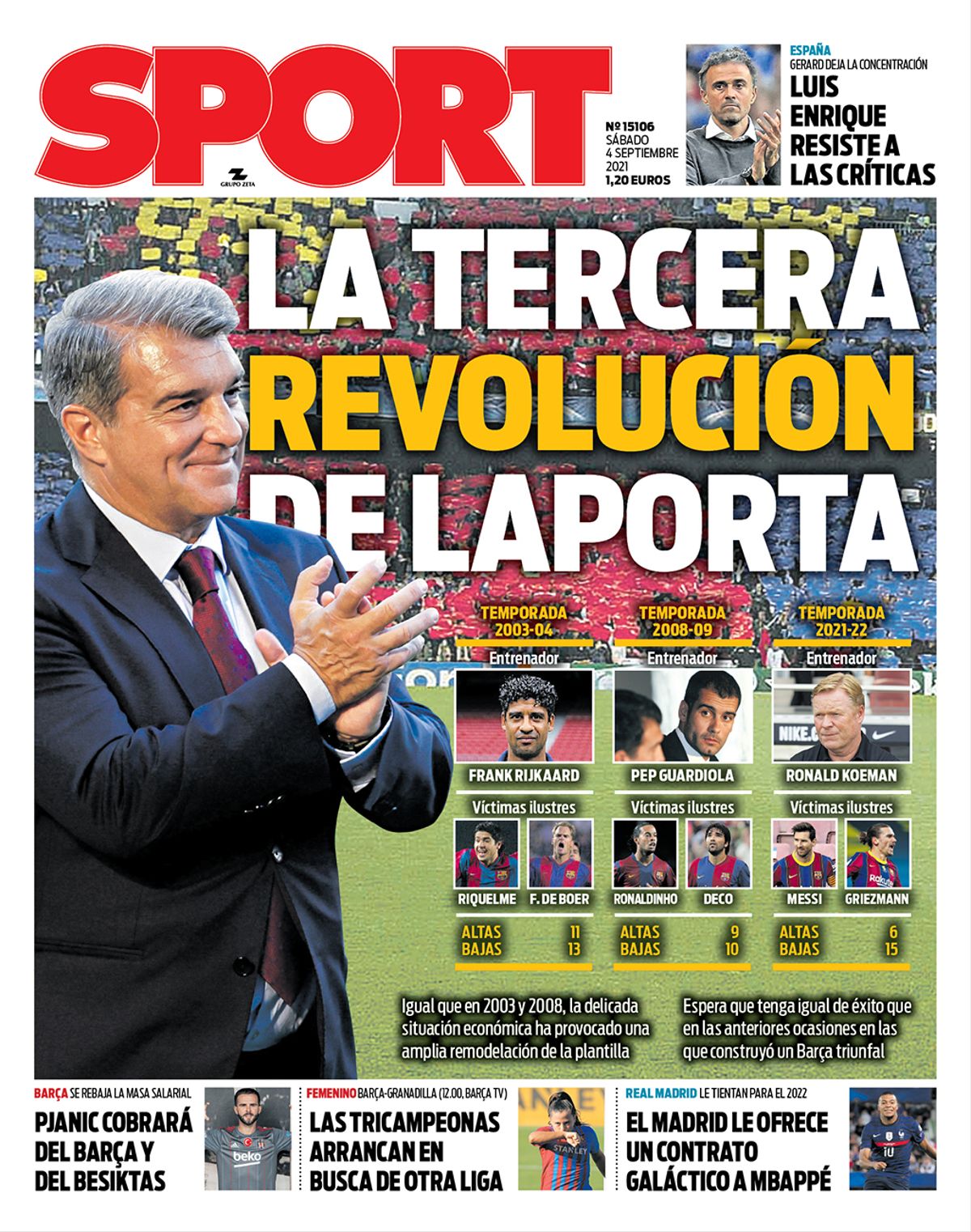 El diario Sport abre la portada del sábado 4 de septiembre con la noticia de que "El Madrid le ofrece un contrato galáctico a Mbappé". Además, mencionan la que denominan como "La tercera revolución de Laporta".