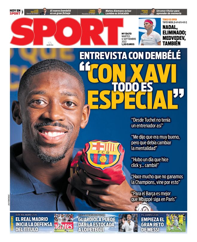 El diario Sport presenta en su portada de hoy una entrevista a Ousmane Dembelé, aunque no se les escapa que el defensor de la UEFA Champions League, el Real Madrid, se inicia esta campaña en la competición esta noche ante el Celtic de Glasgow.