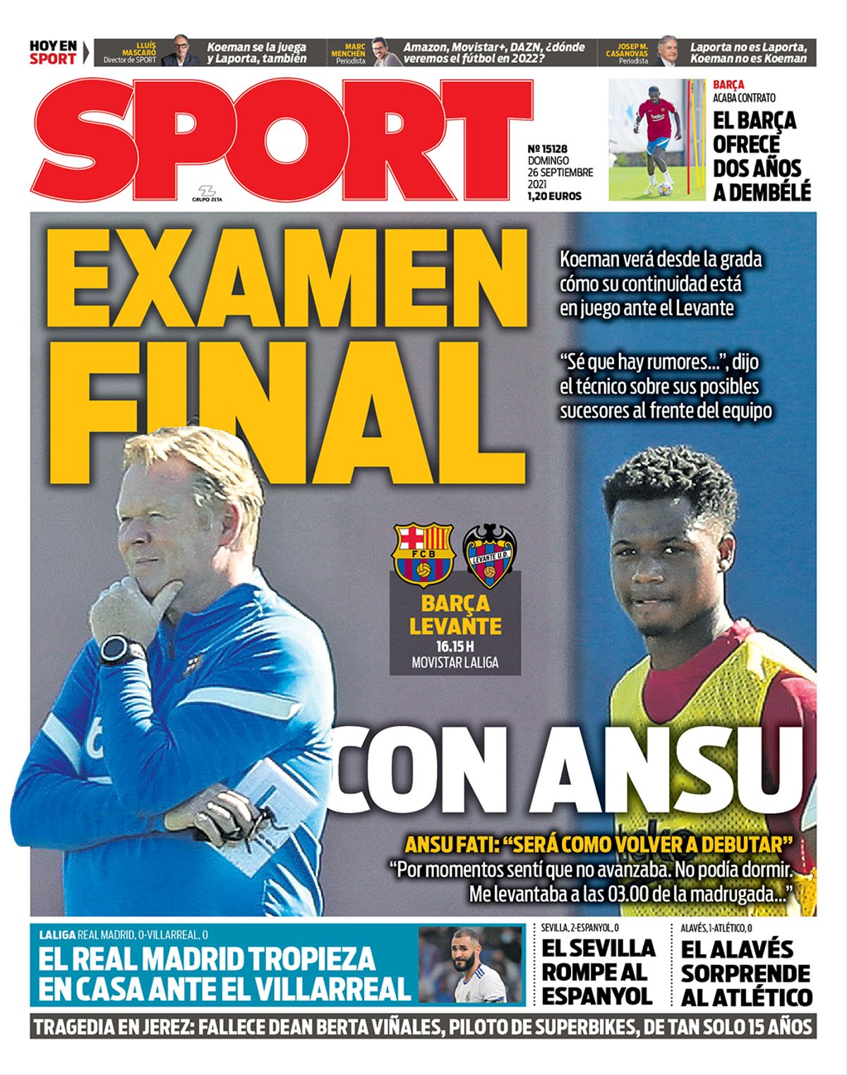 El diario Sport saca hoy en portada la vuelta de Ansu Fati en el FC Barcelona para el partido de hoy ante el Levante y también destaca el tropiezo del Real Madrid frente al Villarreal.