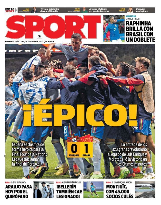 El Diario Sport sale en portada con la victoria de España en Braga frente a la selección de Portugal. Una victoria por la mínima que le clasifica para la Final Four de la Nations League. "La entrada de los azulgranas revoluciono al equipo de Luis Enrique y Morata selló la victoria en los últimos minutos", explica el diario.