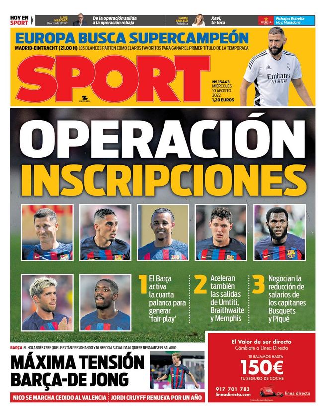 El diario Sport saca este miércoles en su portada el lío que tiene el FC Barcelona con las inscripciones de jugadores, y también destaca el duelo entre el Real Madrid y el Eintracht por la Supercopa de Europa.
