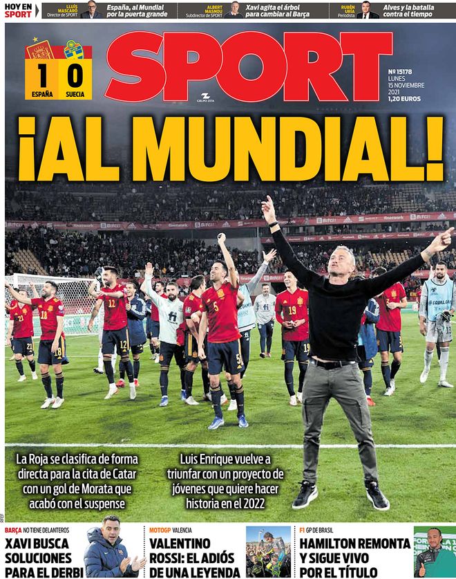 El diario Sport celebra la clasificación de España para el Mundial de Catar en su portada de hoy. 'La Roja' sufrió más de lo deseable ante Suecia, pero finalmente acudirá a la cita mundialista en noviembre de 2022.