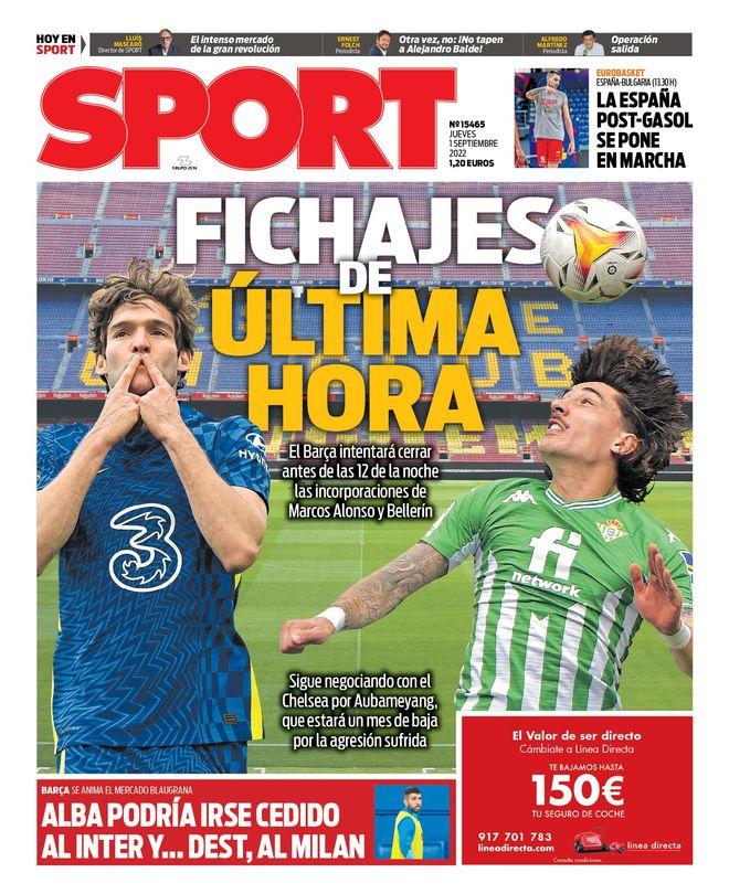El diario Sport lanza en su portada de jueves el cierre de mercado en clave del FC Barcelona, destacando la posibildad del conjunto culé de cerrar el traspaso de dos laterales. En concreto, el equipo azulgrana querría hacerse con Marcos Alonso y Héctor Bellerín.