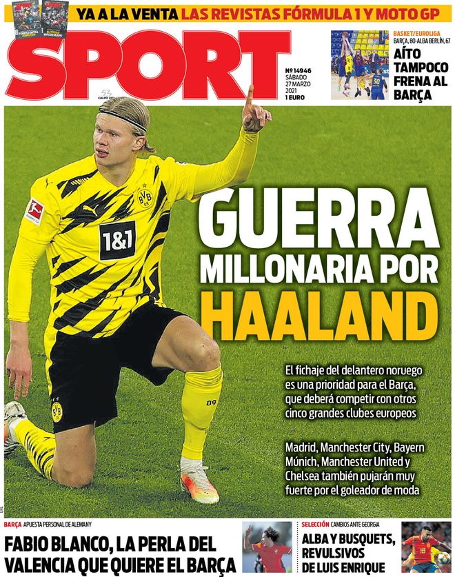 El Sport sale hoy en portada con el fichaje de Haaland. "Guerra millonaria por Haaland", reza el titular de prensa. El mismo diario apunta a que el Barcelona lo da como prioritario, aunque no estará solo en la carrera, ya que el Real Madrid y media Europa también lo están.