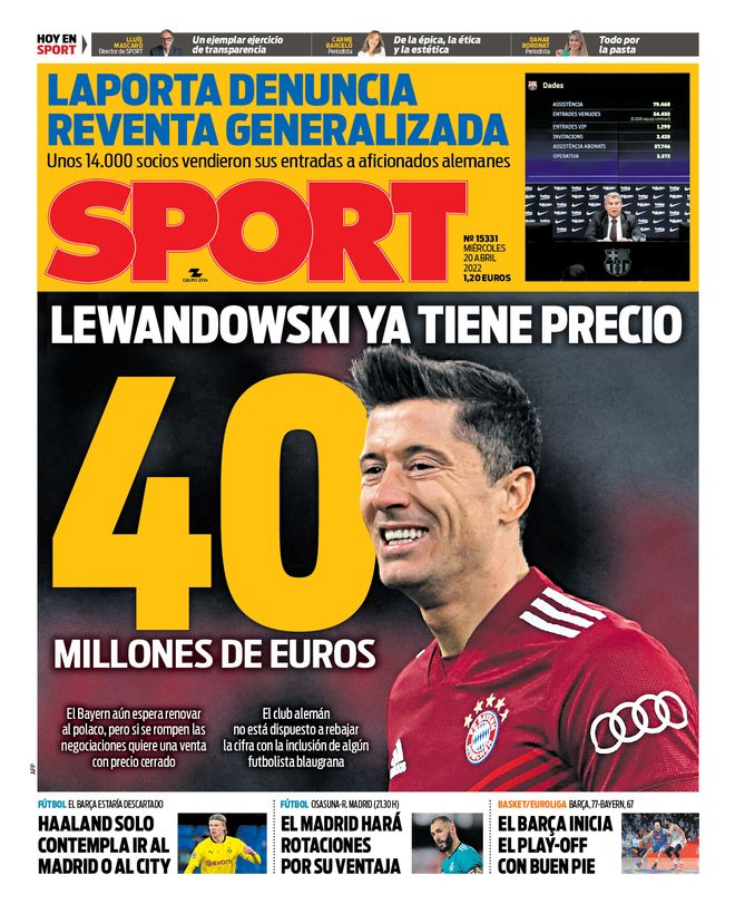 En su edición de este miércoles, el diario Sport abre en portada con Robert Lewandowski, objetivo del FC Barcelona que tiene un precio de 40 millones de euros.