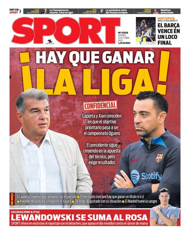 El diario Sport saca hoy en portada el objetivo de Xavi y Laporta: ganar LaLiga.