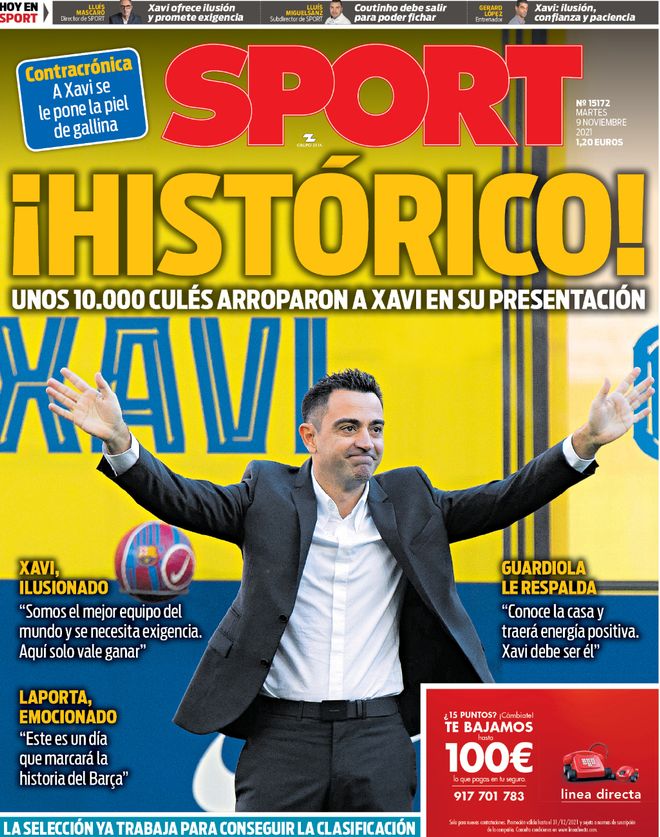 El diario Sport saca hoy en portada la presentación de Xavi Hernández como nuevo entrenador del FC Barcelona.