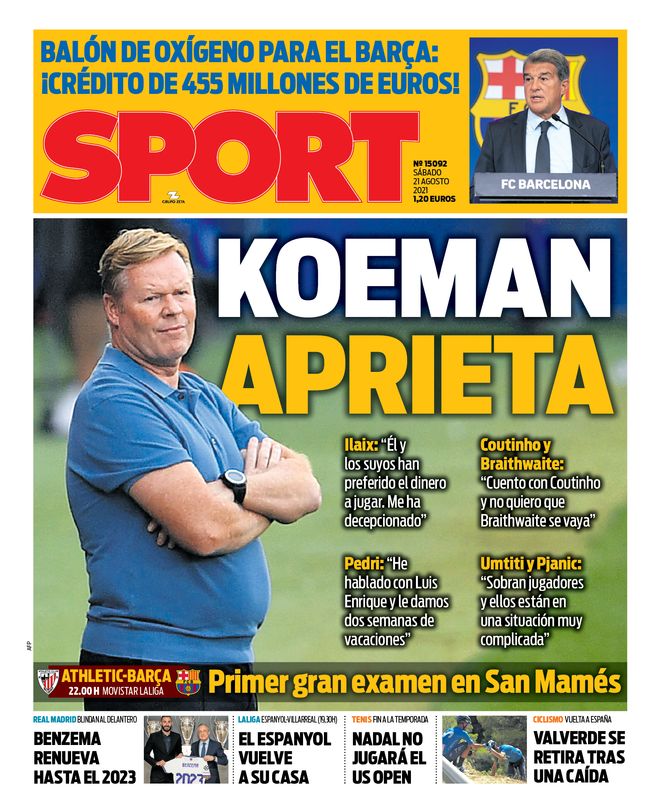 El Sport sale hoy en portada con Koeman y sus exigencias en el Barcelona: "Koeman aprieta", dice el titular de prensa.