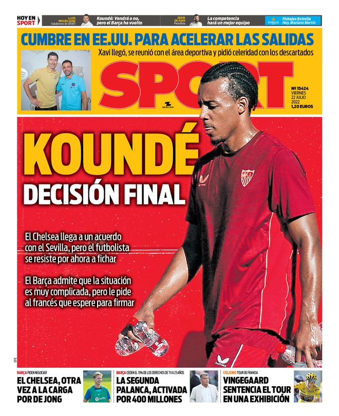 El diario Sport presenta en su portada de este viernes a Jules Koundé y su futuro, que se debate entre el Chelsea y el Barcelona. El Sevilla habría llegado a un acuerdo con el club londinense, pero según el diario catalán el equipo culé le habría pedido al futbolista francés que aguante un poco para firmar por el cuadro azulgrana.