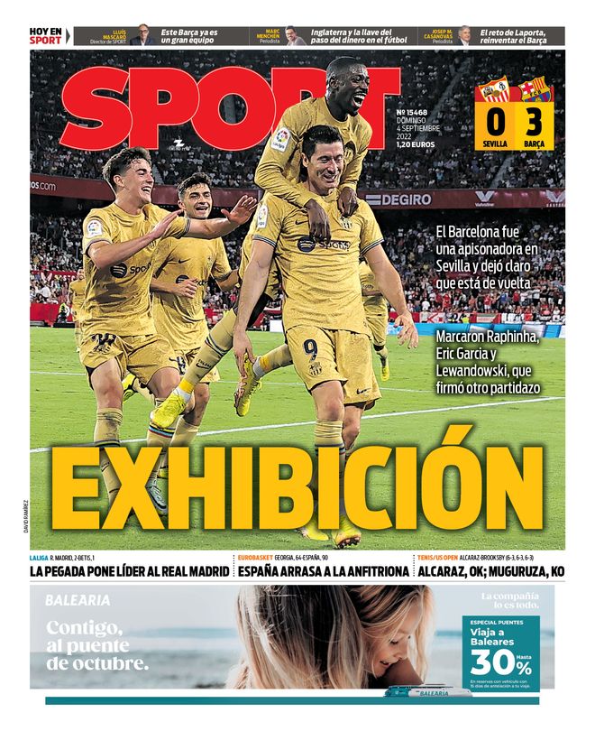 En su edición de este domingo, la portada del diario Sport viene protagoniza por la goleada del FC Barcelona en su visita al Ramón Sánchez-Pizjuán frente al Sevilla. Los de Xavi se impusieron por 0-3 gracias a los goles de Raphinha, Lewandowski... ¡y Eric García!