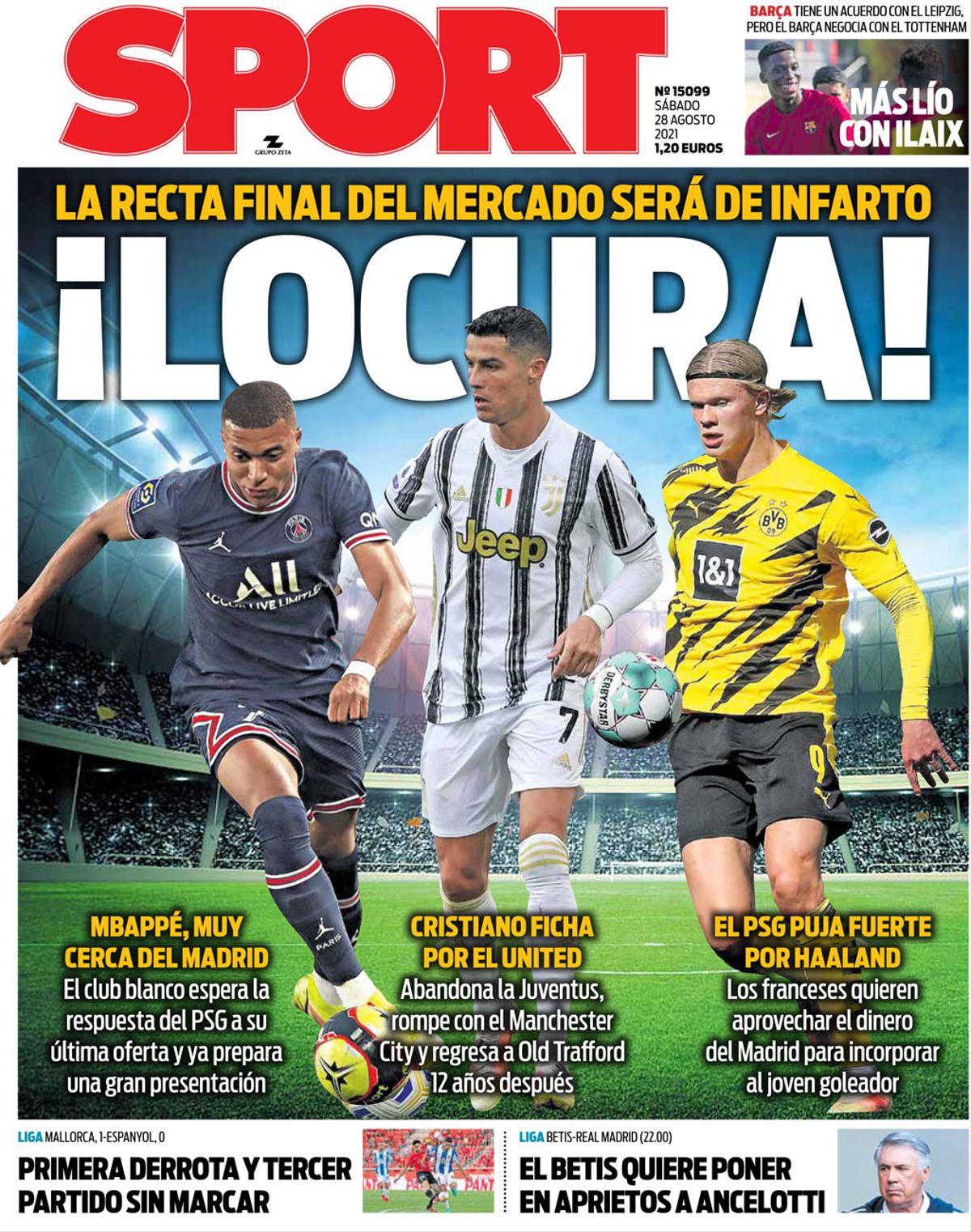 El diario Sport saca hoy en portada la recta final del mercado de fichajes con la vuelta de Cristiano Ronaldo al Manchester United, la inminente salida de Mbappé rumbo al Real Madrid y el interés del PSG por Haaland.