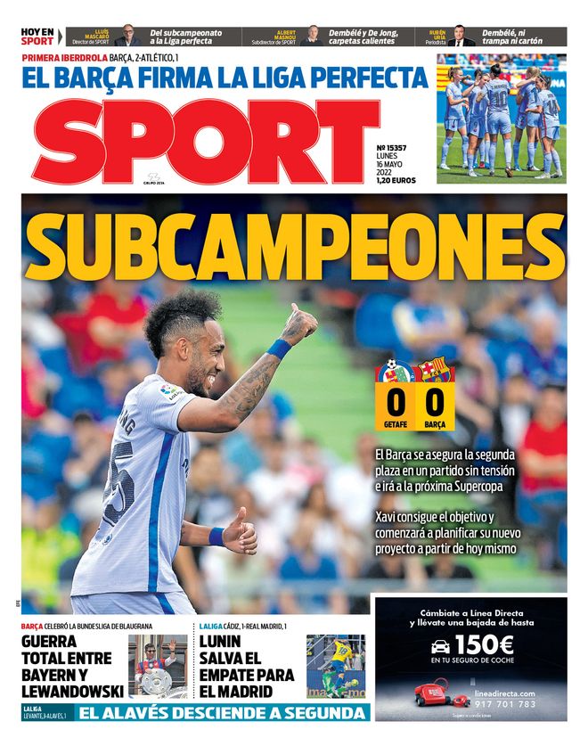 En su edición de este lunes, el diario Sport destaca en portada el empate del FC Barcelona en el Coliseum Alfonso Pérez ante el Getafe. Un resultado que, sumado al resto de la jornada, permite a los culés sellar matemáticamente el segundo puesto que da acceso a la próxima edición de la Supercopa de España.