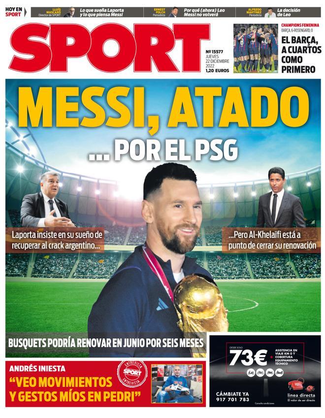 El diario Sport saca este jueves en portada a Leo Messi, cuya renovación con el Paris Saint-Germain es inminente, anulando así un hipotético regreso al FC Barcelona.