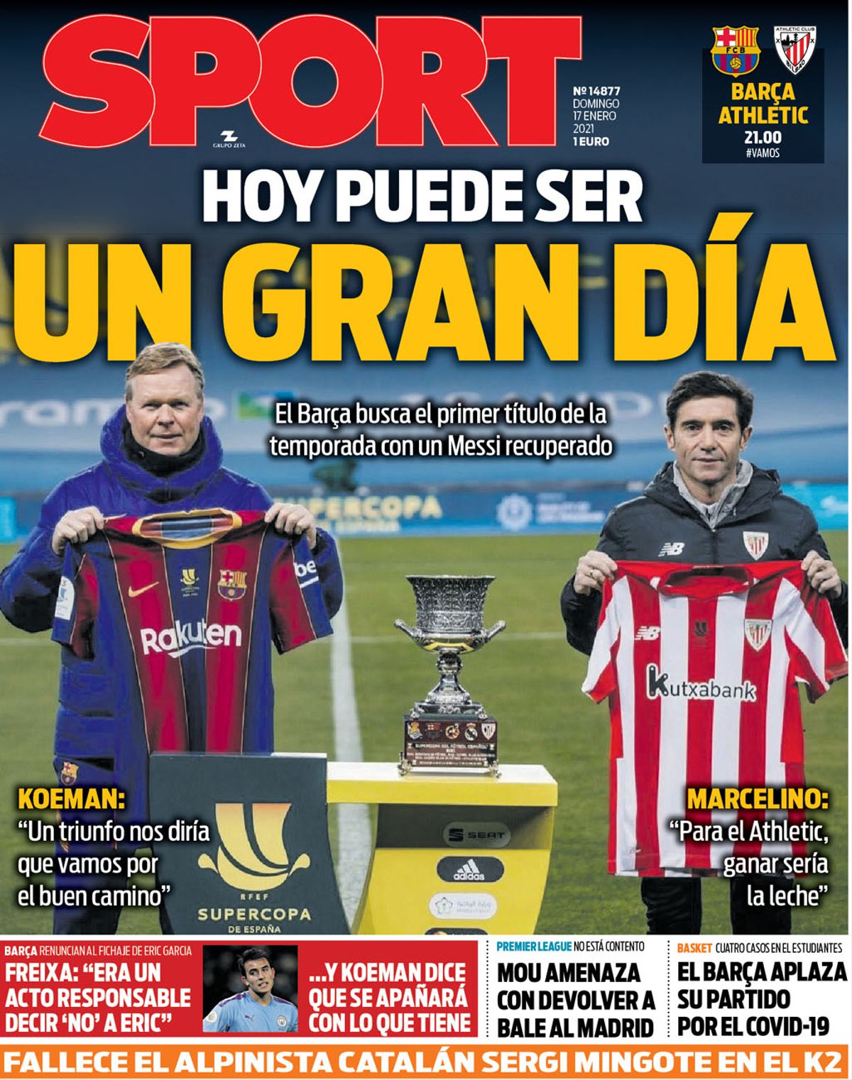El diario Sport saca hoy en portada la final de la Supercopa de España entre el FC Barcelona y el Athletic (21:00h / #Vamos), además del nuevo lío de Gareth Bale en el Tottenham con la amenaza de su entrenador, José Mourinho, con devolverle al Real Madrid.