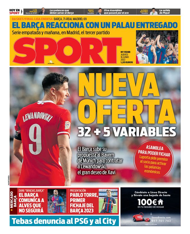 En su edición de este jueves, el diario Sport abre en portada con Robert Lewandowski. Al parecer, el FC Barcelona ha realizado una nueva oferta por el polaco al Bayern Munich: 32 millones de euros fijos más 5 en variables.