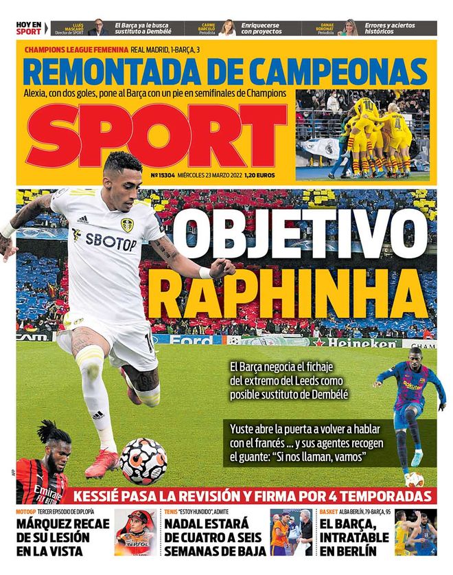 El diario Sport abre su portada de este miércoles con el interés del FC Barcelona en Raphinha, extremo brasileño del Leeds United. Llegaría al Camp Nou como sustituto de un Ousmane Dembélé que termina contrato a final de temporada.