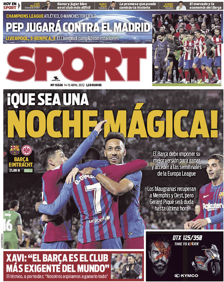 El diario Sport abre en su portada del jueves con la previa del FC Barcelona - Eintracht Frankfurt previsto para esta noche. Asimismo, destaca el pase a semifinales del Manchester City, que se medirá al Real Madrid en busca de un sitio en la final de París.
