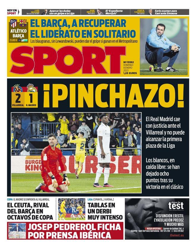 El diario Sport publica en su portada de domingo la derrota del Real Madrid en casa del Villarreal destacando que el conjunto blanco no podrá alcanzar la primera posición. También resaltan que el cuadro merengue se enfrentará al submarino amarillo en los octavos de final de Copa del Rey.