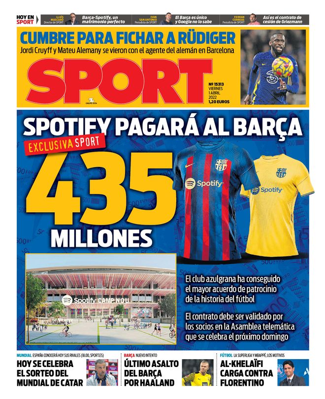 El diario Sport saca hoy en portada el acuerdo entre el FC Barcelona y Spotify, que pagará 435 millones de euros por el patrocinio. Asimismo, el periódico también destaca una cumbre para fichar a Rüdiger y el último asalto que quiere realizar el Barça para hacerse con Haaland.