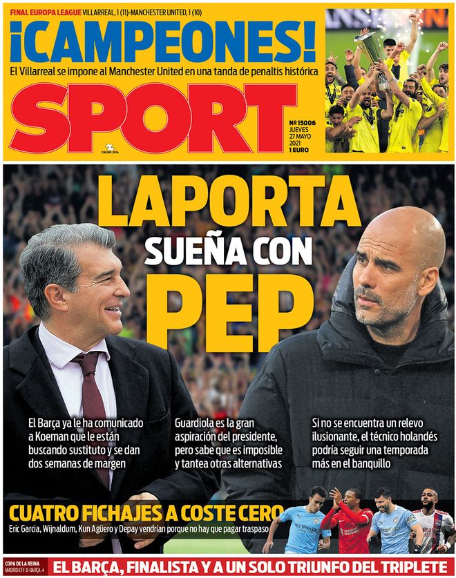 En su portada de este jueves, el diario Sport abre con el gran sueño de Joan Laporta para el banquillo del Barcelona, y ese no sería otro que Pep Guardiola. El actual entrenador del Manchester City podría regresar al Camp Nou para suceder a Ronald Koeman. Eso sí, el periódico catalán añade que por ahora es una opción "imposible".